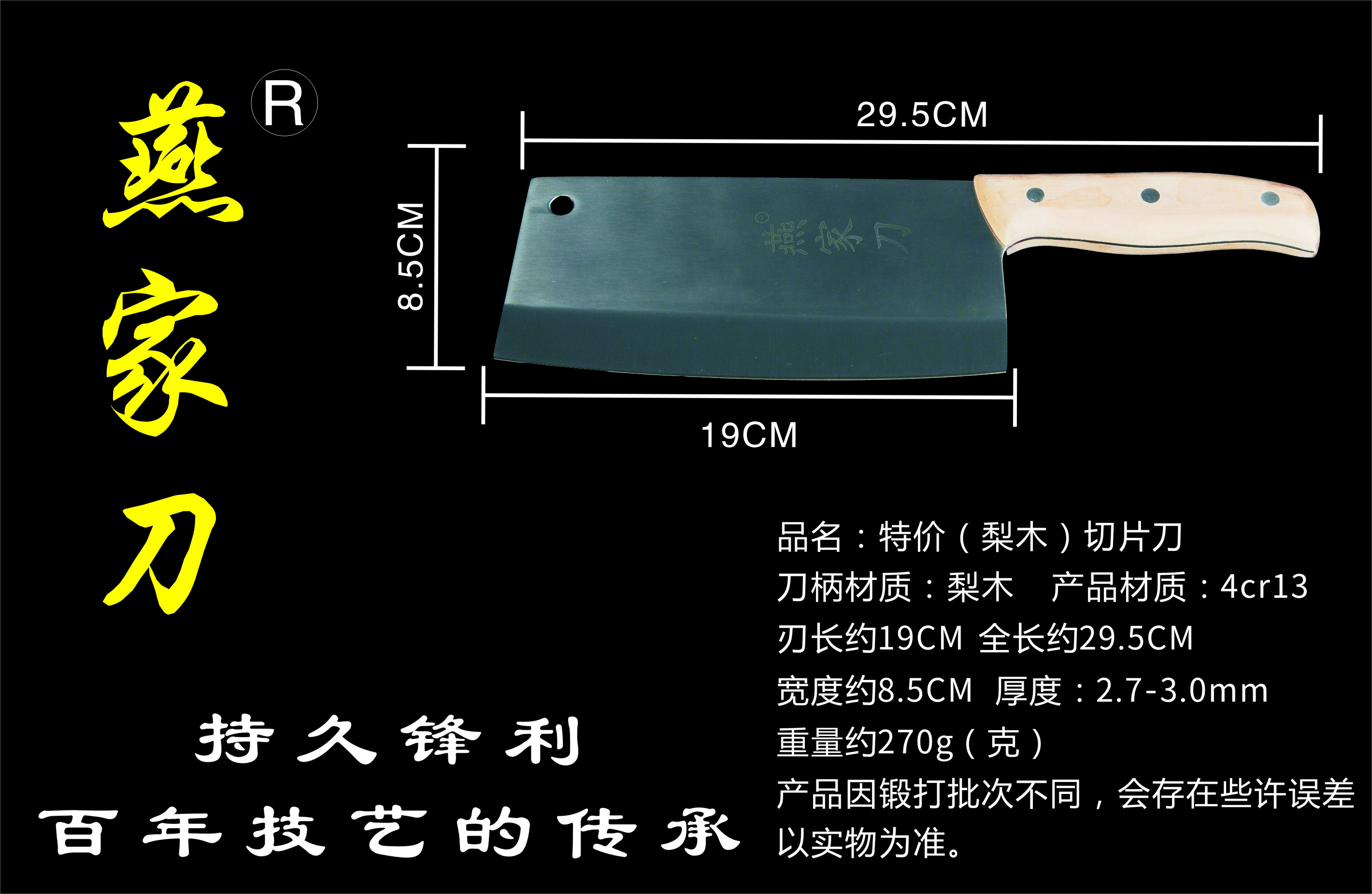 樂山燕家刀具有限公司(公司前身為燕佳鐵匠鋪),公司坐落于美麗的佛都之鄉(xiāng)樂山嘉州,在全國(guó)各地有上千家代理經(jīng)銷點(diǎn),公司專業(yè)銷售、設(shè)計(jì)、制作各類刀具。秉承一貫鍛造三精要求,即選料精、用料精、工藝精。所選材料全部產(chǎn)自滇東鐵礦優(yōu)產(chǎn)區(qū)。本品牌刀具堅(jiān)持千挑萬選為材,千錘百煉為刀的手工鍛造工藝宗旨。具有鋒利耐磨、持久耐用,用料上乘,硬度高、韌度強(qiáng)的特點(diǎn)!